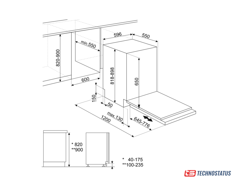 загрузка на 10 комплектов посуды, электронное управление, 8 программ, 44.8×55×82 см, нержавеющая сталь цвет, сушка: конденсационная, половинная загрузка, индикация на полу: луч
