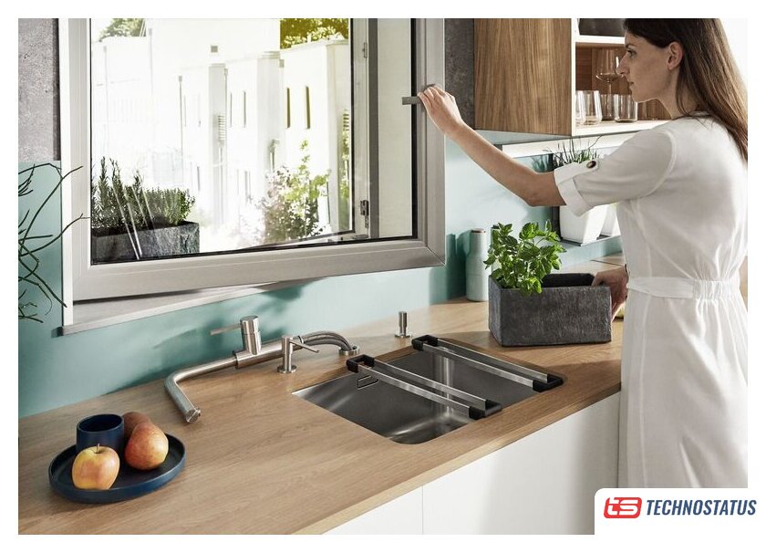 Другие особенности | Подходит для установки перед окном — смеситель можно просто вытащить вертикально вверх и положить на бок. |