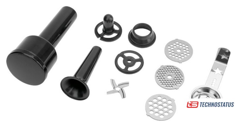 | Полная комплектация | 3 диска из нержавеющей стали, нож из нержавеющей стали, насадка для колбас, насадка для печенья (4 формы), насадка для кеббе, металлический лоток |