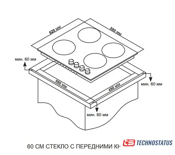газовая на 4 конфорки, закаленное стекло, мощность: 7000 Вт, автоматический электроподжиг, газ-контроль, решетки: чугун, независимая установка, размеры (ШхГ): 59x52 см