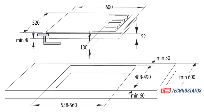 газовая на 4 конфорки, закаленное стекло, мощность: 8300 Вт, автоматический электроподжиг, газ-контроль, решетки: чугун, независимая установка, размеры (ШхГ): 60x52 см