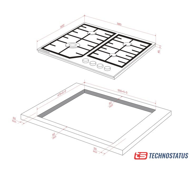 газовая на 4 конфорки, закаленное стекло, мощность: 8000 Вт, автоматический электроподжиг, газ-контроль, решетки: чугун, независимая установка, размеры (ШхГ): 58x51 см