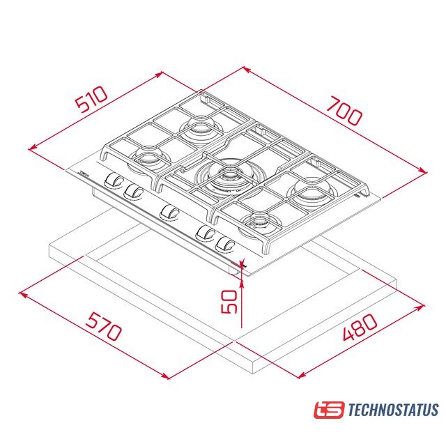 | Подробная информация о конфорках | 1 горелка с двойным пламенем (4 кВт) 1 быстрая горелка (2,8 кВт) 2 полубыстрых горелки (по 1,75 кВт) 1 вспомогательная горелка (1 кВт) |