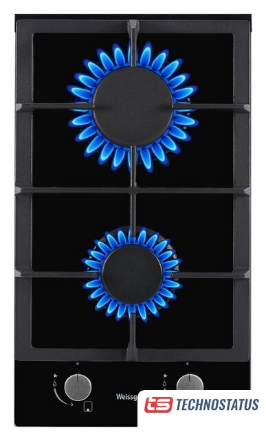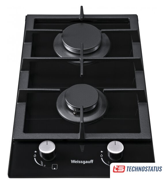 газовая на 2 конфорки, закаленное стекло, мощность: 3800 Вт, автоматический электроподжиг, газ-контроль, решетки: чугун, независимая установка, размеры (ШхГ): 29x52 см