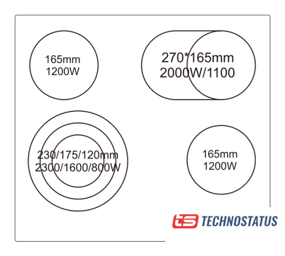 Подробная информация о конфорках | 2x165 мм (1200 Вт)1x165x270 мм (1100/2000 Вт)1x120-175-230 мм (800-1600-2300 Вт) |