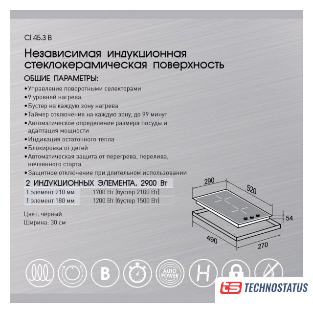 Подробная информация о конфорках | 210 мм, 1700 Вт (бустер 2100 Вт), 180 мм, 1200 Вт (бустер 1500 Вт) |