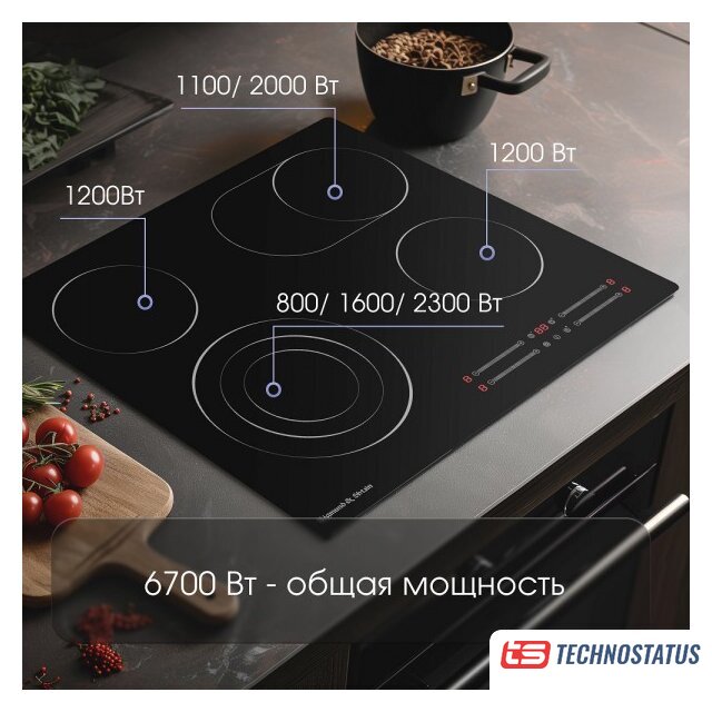 Подробная информация о конфорках | 1200; 1200; 1100/2000; 800/1600/2300 вт |