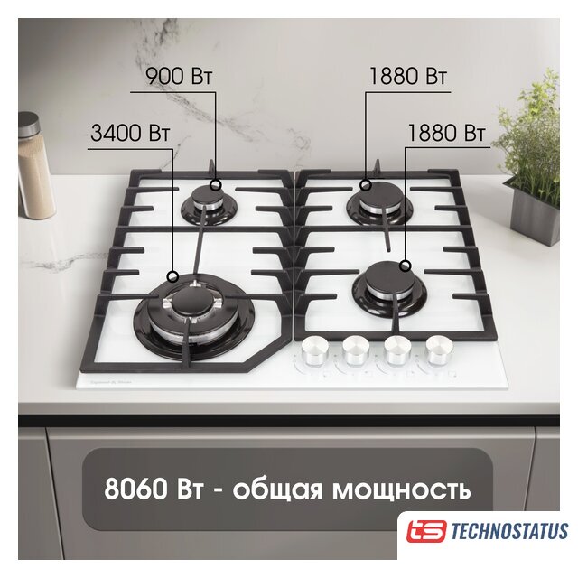 газовая на 4 конфорки, закаленное стекло, мощность: 7800 Вт, автоматический электроподжиг, газ-контроль, решетки: чугун, размеры (ШхГ): 58x51 см