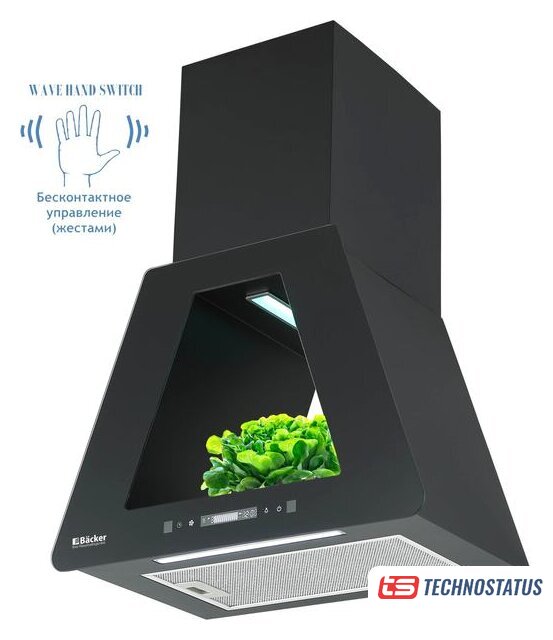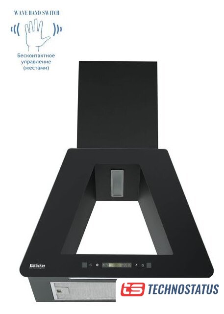 конструкция купольная, монтаж настенный, ширина 59.8 см, управление механическое/кнопочное, производительность мотора 850 м³/ч, цвет черный