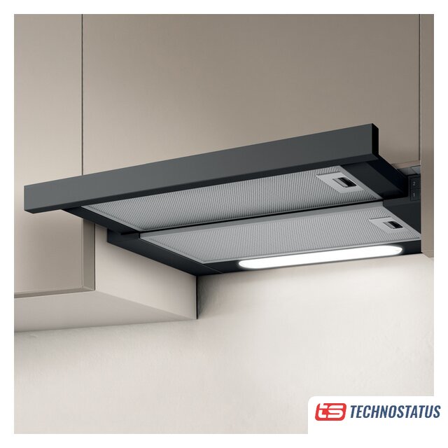 конструкция телескопическая, монтаж для встраивания, управление механическое/кнопочное, производительность мотора 650 м³/ч, ширина 59.8 см