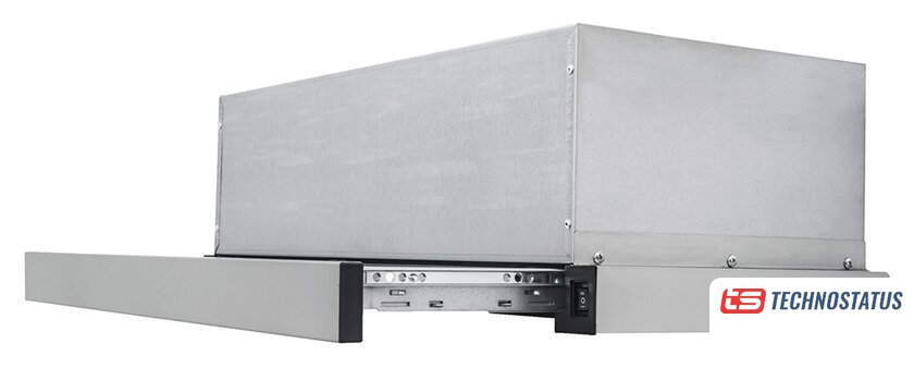 конструкция телескопическая, монтаж для встраивания, ширина 59.5 см, управление механическое/кнопочное, производительность мотора 600 м³/ч, цвет нержавеющая сталь