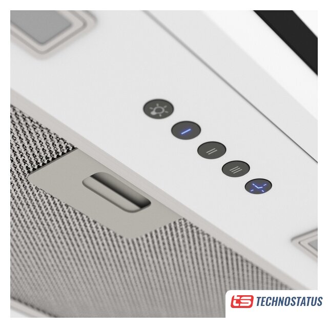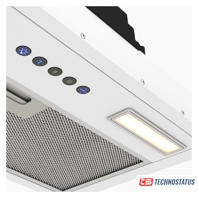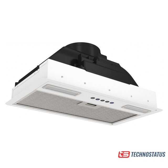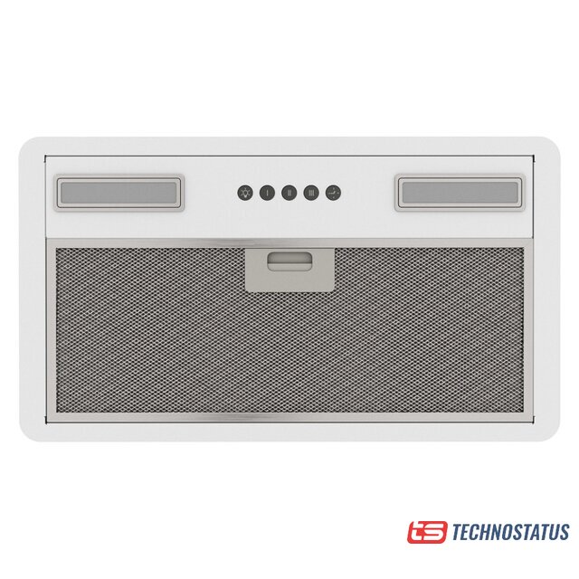 конструкция скрытая, монтаж для встраивания, ширина 59.8 см, управление механическое/кнопочное, производительность мотора 1050 м³/ч, цвет белый