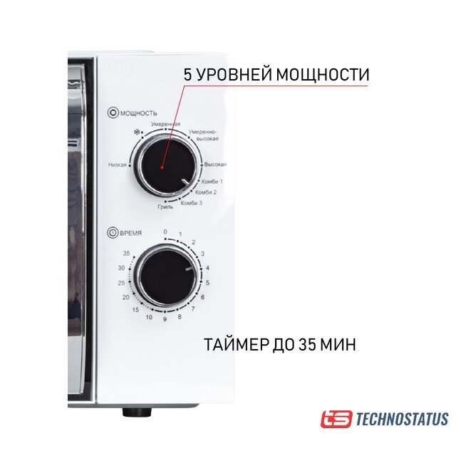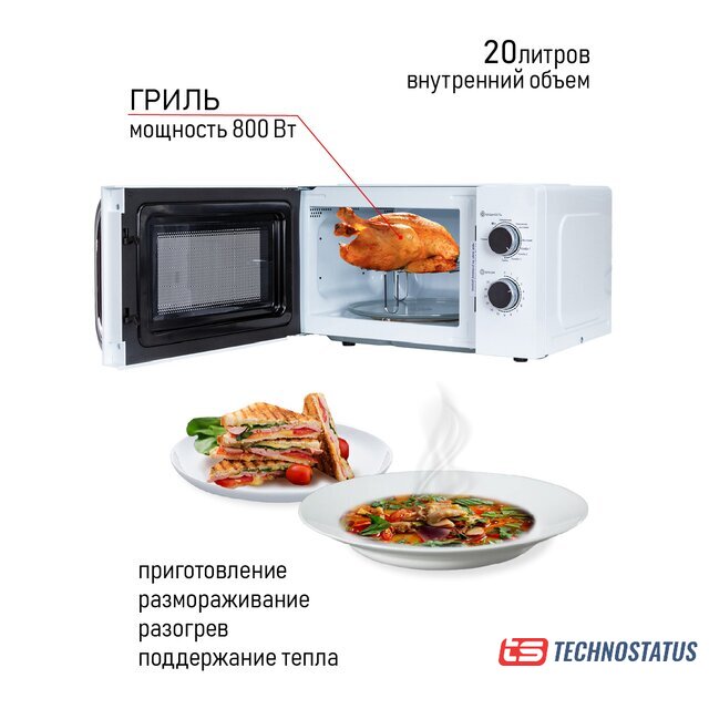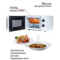 отдельностоящая, микроволны (соло), объем 20 л, выходная мощность микроволн 700 Вт, управление механическое, цвет белый