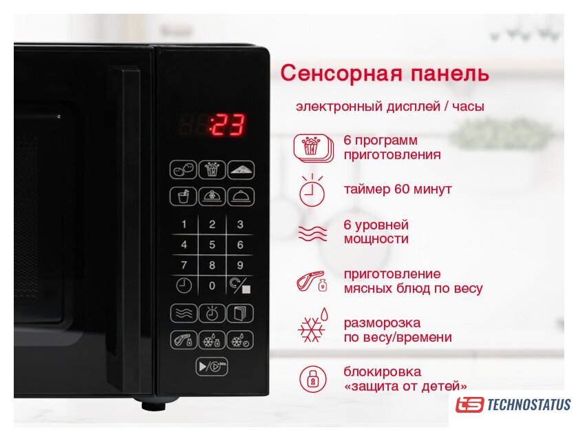 отдельностоящая, микроволны (соло), объем 25 л, выходная мощность микроволн 800 Вт, управление сенсорное, автоприготовление, авторазмораживание, цвет серебристый/черный
