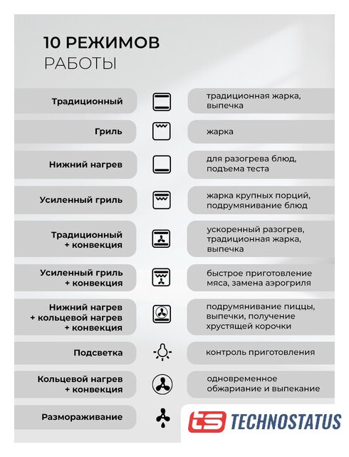 | Дополнительные режимы | Кольцевой нагрев с конвекцией, Кольцевой нагрев с конвекцией и нижним нагревом |