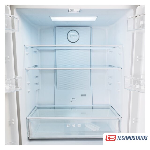 отдельностоящий, полный No Frost, электронное управление, класс A+, полезный объём: 351 л (257 + 94 л), перенавешиваемые двери, полка для вина, лоток для яиц, отделка: стекло, 59.5x63.5x200 см, белый