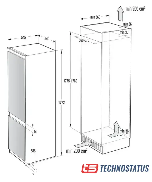 встраиваемый, без No Frost, электронное управление, класс A+, полезный объём: 272 л (195 + 72 л), перенавешиваемые двери, лоток для яиц, 54x54.9x177.9 см, белый