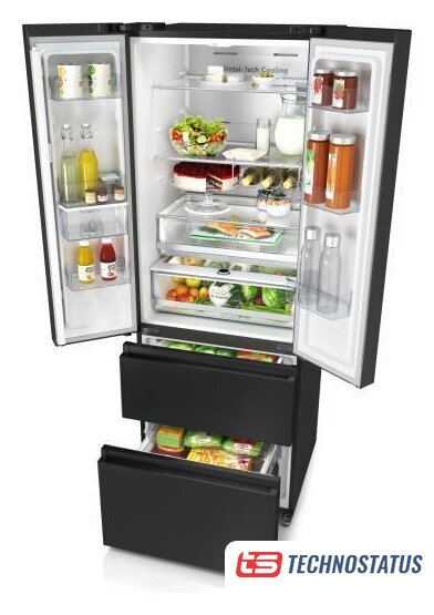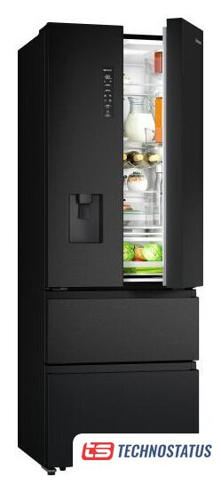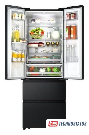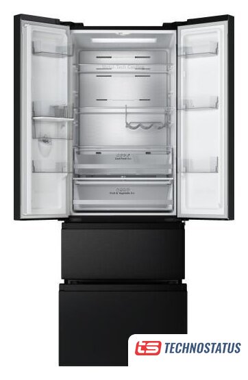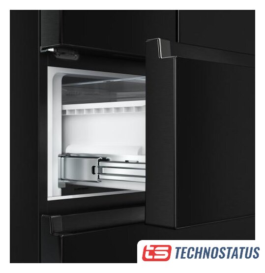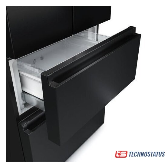 отдельностоящий, полный No Frost, электронное управление, класс A++, полезный объём: 578 л (430 + 148 л), инверторный компрессор, зона свежести, выдвижная полка, лоток для яиц, отделка: стекло, 80x73.5x185 см, черный