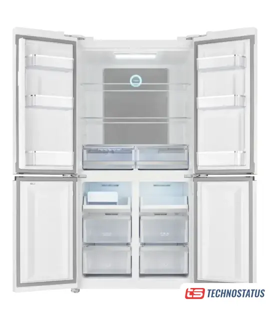 отдельностоящий, полный No Frost, электронное управление, класс A++, полезный объём: 578 л (430 + 148 л), инверторный компрессор, зона свежести, выдвижная полка, лоток для яиц, отделка: стекло, 80x73.5x185 см, серебристый