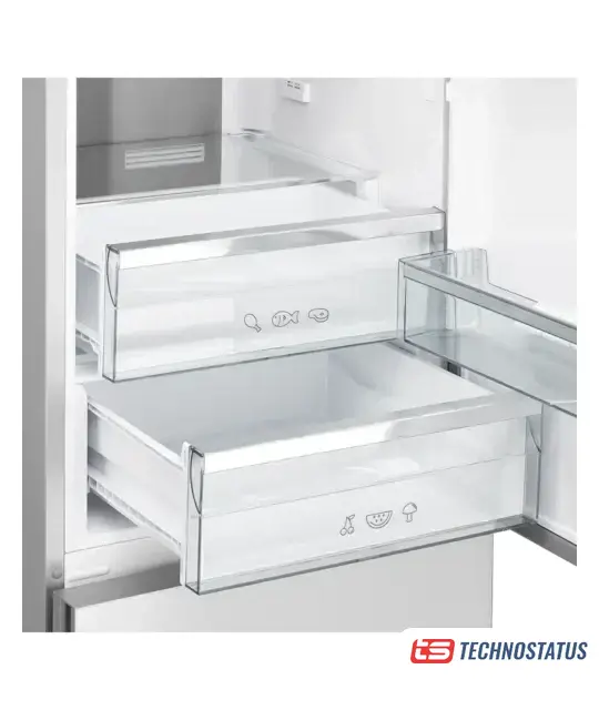 отдельностоящий, полный No Frost, электронное управление, класс A, полезный объём: 368 л (263 + 105 л), перенавешиваемые двери, складная полка, лоток для яиц, 59.5x65x200 см, бежевый