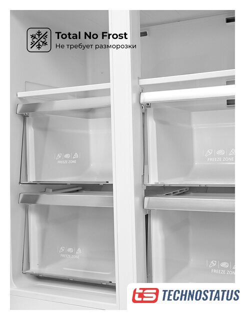 отдельностоящий, No Frost (морозильная камера), электронное управление, класс A+, полезный объём: 615 л (370 + 245 л), зона свежести, перенавешиваемые двери, полка для вина, лоток для яиц, 119x62.9x186.8 см, белый