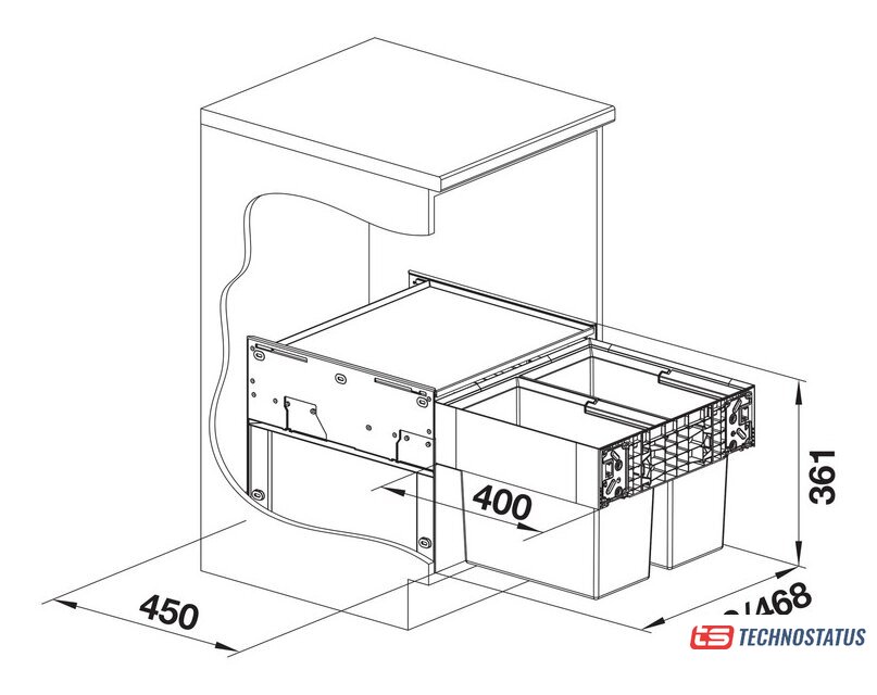 Особенности конструкции | Высота установки 361 мм, глубина установки 400 мм, требуемый внутренний размер шкафа (глубина) 450 мм.Необходима входная дверь без петель и отверстий, обратите внимание на расположение ручек.Подходит также для установки в шкафы с кассетными дверцами с рамой от 40 мм.При планировании следует учитывать высоту установки системы корзин, глубину мойки и минимальный размер тумбы, чтобы можно было разместить слив между корзиной и дном мойки, а также глубину тумбы по направлению к стене, чтобы можно было выполнить монтаж слива с затвором за системой корзин в сливное отверстие. |